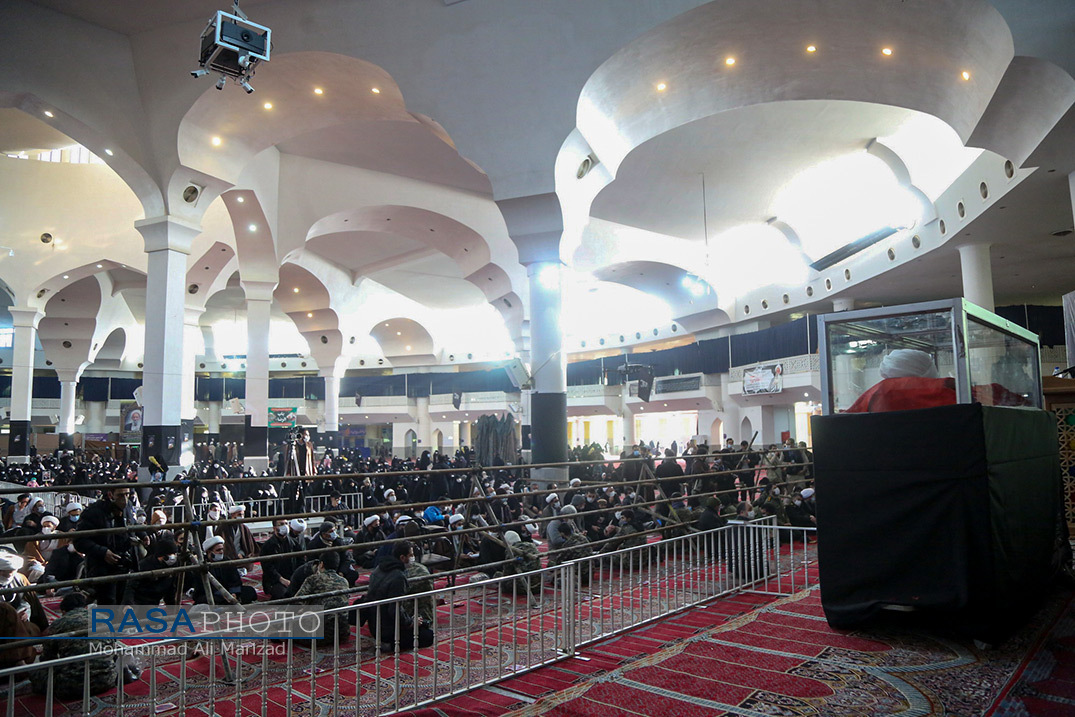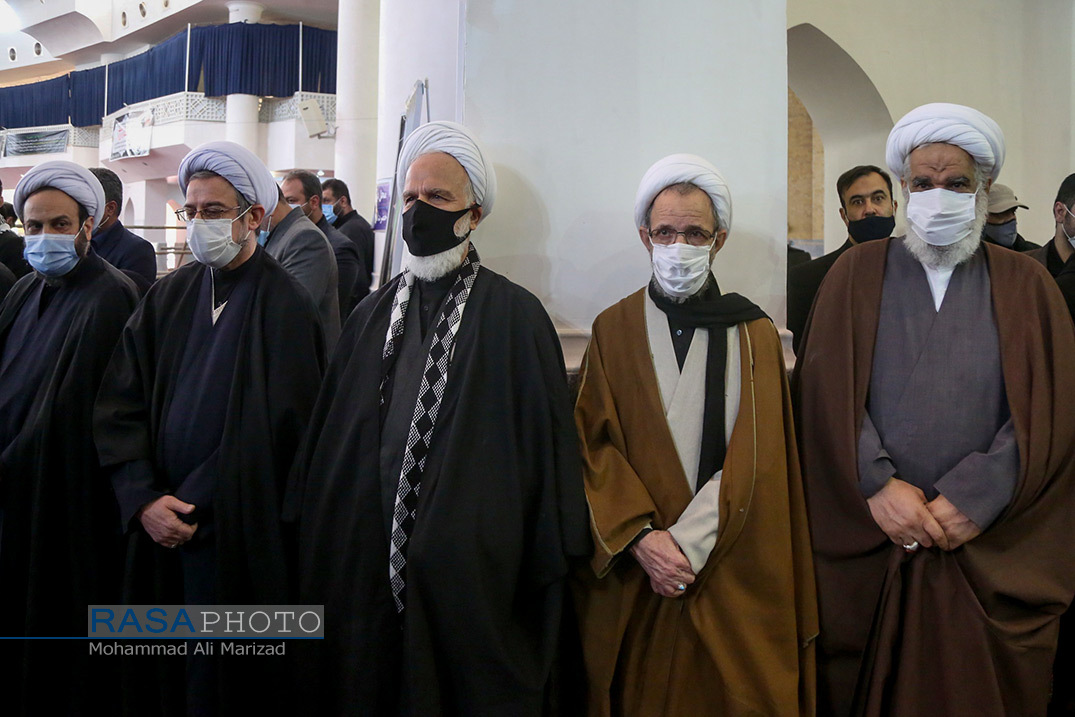 پیکر مطهر علامه وارد حرم حضرت معصومه(س) و بر دستان مردم شریف قم به جلوی صحن امام رضا(ع) منتقل می شود؛ حاج عباس حیدر زاده در جایگاه قرار می گیرد و با نوای گرم و دلنشین خود بغض مردم را می ترکاند؛ علما، اساتید، طلاب و روحانیون و مردم شریف قم اشک های خود را بدرقه عمار انقلاب می کنند و برای اقامه نماز به امامت حضرت آیت الله نوری همدانی آماده می شوند.