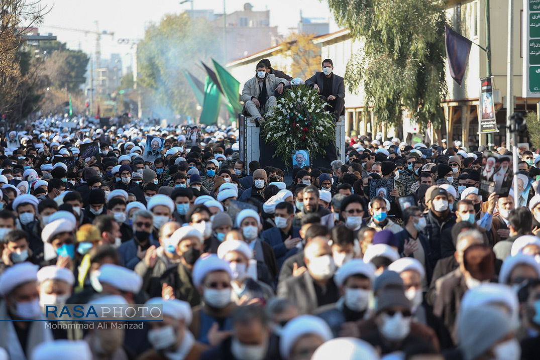 شعار «لا اله الا الله» برای تشییع پیکر پاک عمار انقلاب از سوی مداح اهل بیت(ع) در خیابان صفائیه، حد فاصل مصلای قدس و آستان مقدس بانوی کرامت طنین انداز شد و جمعیت نیز بدان پاسخ می دادند؛ با جمعیت همراه شدم؛ همه آمده بودند، پیر و جوان، بزرگ و کوچک و حضور دهه هشتادی ها در این مراسم رنگ و لعاب دیگری به آن بخشیده بود؛ گویی نسل آینده به میدان آمده اند تا فرهنگ قدردانی از علمای دین و عشق و ارادت به مکتب اهل بیت(ع) را از پردان و مادران خود بیاموزند.