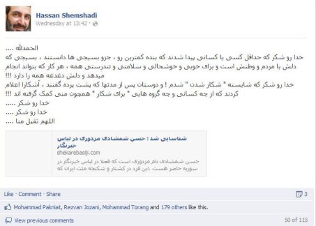اين اتفاق بامزه، با واكنش جالب شمشادي واقع شد و در صفحه فيس بوك خود با انتشار متني نوشت: