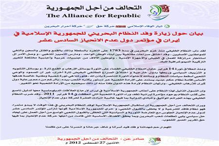احزاب عضو گروه "ائتلاف برای جمهوری" در بحرین، سفر هیأت این کشور به ایران برای شرکت در اجلاس سران عضو کشورهای جنبش عدم تعهد را دلیلی بر دروغ بودن ادعاهای رژیم آل خلیفه مبنی بر دخالت ایران در بحرین دانست.