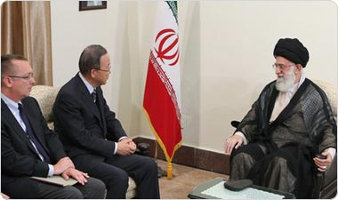 حضرت آيت الله خامنه ای رهبر معظم انقلاب اسلامی عصر امروز (چهارشنبه) در ديدار آقای بان كی مون دبيركل سازمان ملل و هيأت همراه، با اشاره به سابقه تمدن و فرهنگ ايرانی خاطرنشان كردند: با توجه به جايگاه مهم و برتر ملت ايران در مسائل فرهنگی و تمدنی، جمهوری اسلامی ايران زمينه بسيار خوبی برای گسترش فرهنگ و تمدن انسانی برخاسته از اسلام دارد. ايشان در ادامه با اشاره به نگرانی های مشترك بشريت از جمله موضوع خلع سلاح اتمی، تأكيد كردند: جمهوری اسلامی ايران بر موضع «خاورميانه عاری از سلاح اتمی» اصرار دارد و سازمان ملل متحد بايد درخصوص رفع نگرانی های موجود در زمينه سلاح اتمی، تلاش جدی انجام دهد .