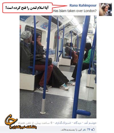 رعنا رحيمپور مجري شبکه بي بي سي فارسي با انتشار عکسي در فيس بوک که از يک واگن مترو شهر لندن از زنان محجبه گرفته تعجب و خشم خود را از رشد زنان محجبه سوال کرده است Has Islam taken over London?" آيا اسلام لندن را فتح کرده است؟" و نوشته است تنها زن بيحجاب آن واگن بوده!