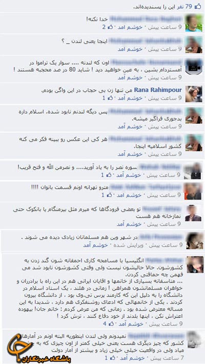 نظرات دوستان و همفکران اين مجري رسانه انگليسي نيز که از کشورهاي مختلف اروپايي و آمريکايي هستند در مورد اين عکس نيز بسيار جالب و خواندني است، دوستان اين کارمند وطن فروش ملکه انگليس با ابراز همدردي با وي نوشتند که در شهرهاي مختلف اروپا و آمريکا نيز زنان مسلمان محجبه بسياري را ميبينند.