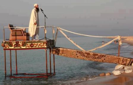 یک مفتی وهابی در اقدامی عجیب منبری را در یکی از سواحل تونس ساخته و تلاش کرده که نماز جماعت خود را در کنار ساحل برگزار کند.