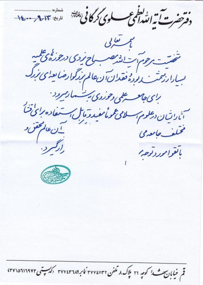 آیت الله علوی گرگانی در خصوص آثار آیت الله مصباح یزدی نکات ارزشمندی نگاشته اند: