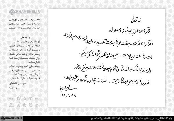 به گزارش تبيين به نقل از پايگاه اطلاع رساني مقام معظم رهبري، حضرت آیتالله خامنهای رهبر معظم انقلاب اسلامی در پاسخ به نامهی رئيس كميته ملی پارالمپيك، از قهرمانان جانباز و معلول جمهوری اسلامی ایران در پارالمپيك ۲۰۱۲ لندن تقدیر كردند و پایبندی آنها به ارزشها و احكام اسلامی را درخور قدردانی و سپاس جداگانه دانستند.