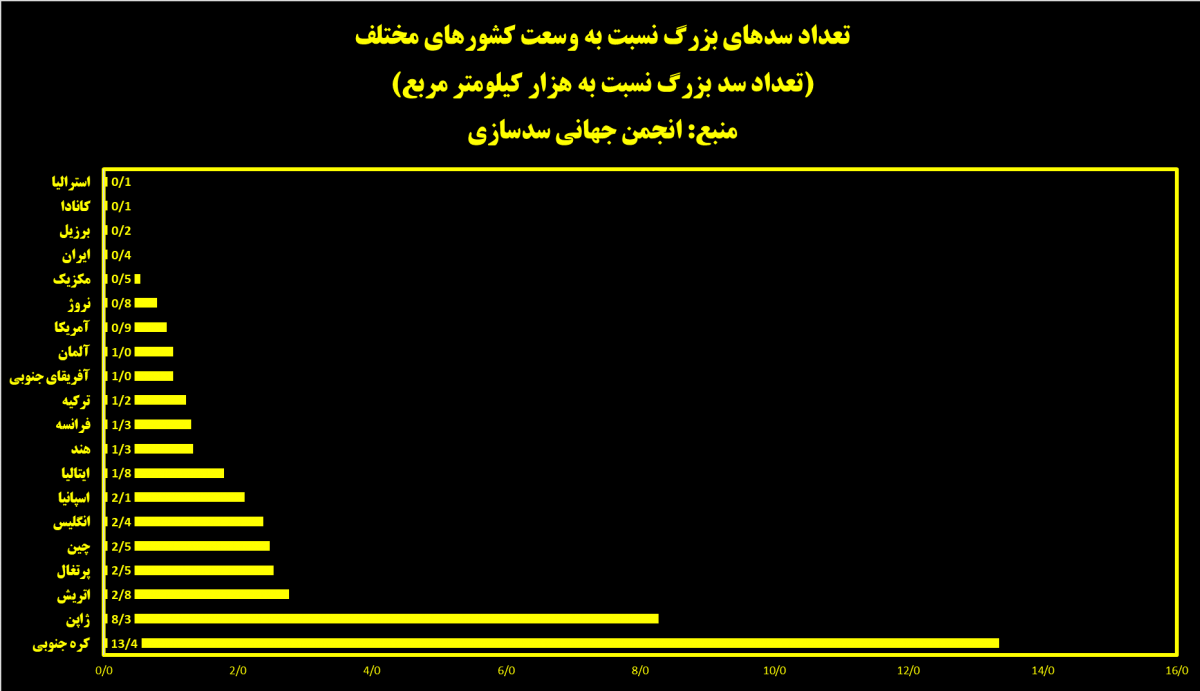 بر این مبنا شاخص تعداد سدهای بزرگ نسبت به وسعت سرزمینی را برای مقایسه صحیحتر مد نظر قرار دادهایم. این شاخص از تقسیم تعداد سدهای بزرگ هر کشور نسبت به مساحت هر کشور محاسبه میشود.