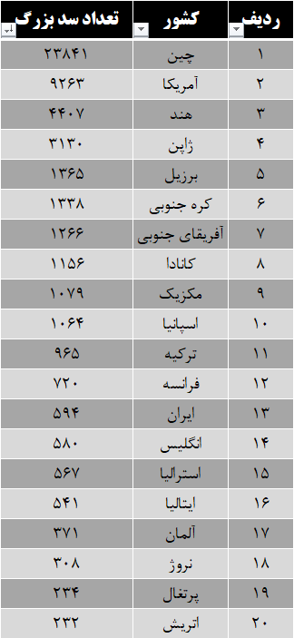 بر این اساس، بررسی تعداد سدهای بزرگ 20 کشور توسعه یافته و در حال توسعه دنیا را در دستور کار قرار دادیم. مطابق آمار انجمن جهانی سدسازی کشور چین بزرگترین دارنده سدهای بزرگ در دنیا است و تعداد سدهای این کشور به عدد 23 هزار 841 سد رسیده است.