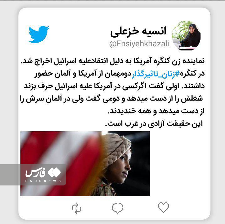 انسیه خزعلی در توییتر خود از اخراج نماینده زن کنگره آمریکا به دلیل انتقاد به اسرائیل گفت.