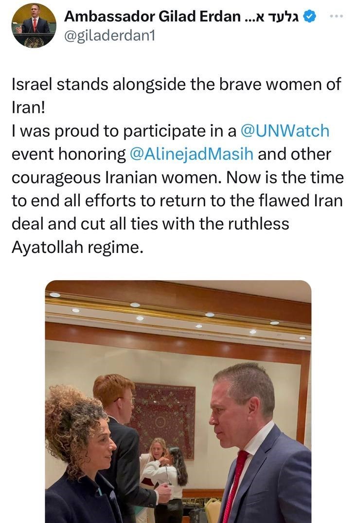 به گزارش خبرگزاری تسنیم، مصی علینژاد از عناصر فعّال ضد ایرانی در خارج از کشور که همراه با رضا پهلوی و برخی دیگر ضمن تلاشهای ضدایرانی خود همواره کمپینهایی را برای تشدید تحریم علیه ایران و حتی مشروع سازی اقدام نظامی علیه کشور راهاندازی کردهاند این بار با گیعاد آردان نماینده رژیم صهیونیستی در سازمان ملل دیدار کرده است!
