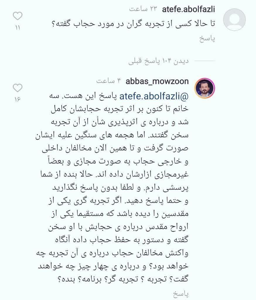 پاسخ مجری برنامه زندگی پس از زندگی به پرسشی درمورد اینکه آیا کسی از تجربه گران درمورد حجاب مطلبی گفته است یا خیر؟ حداقل ۳ خانم پس از تجربه حجابشان کامل شده است و درباره آن تجربه سخن گفتهاند اما به علت هجمه سنگین مخالفان مورد آزار قرار گرفتهاند.