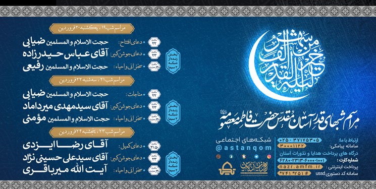 مراسم شبهای قدر با سخنرانی آیتالله میرباقری و حججاسلام والمسلمین مؤمنی و رفیعی همراه با قرائت دعا توسط حجتالاسلام والمسلمین ضیایی، میرداماد، حسینینژاد، حیدرزاده و ایزدی در حرم حضرت معصومه(س) برگزار و به صورت زنده از شبکه دو سیما منعکس میشود.
