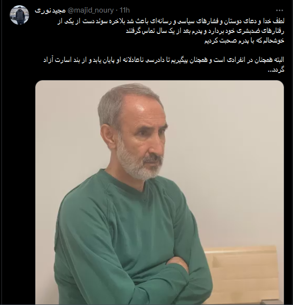 مجید نوری فرزند حمید نوری، تبعه ایرانی بازداشت شده در سوئد، در توییتی نوشت: لطف خدا و دعای دوستان و فشارهای سیاسی و رسانهای باعث شد بالاخره سوئد دست از یکی از رفتارهای ضدبشری خود بردارد و پدرم بعد از یک سال تماس گرفتند. خوشحالم که با پدرم صحبت کردیم البته همچنان در انفرادی است و همچنان پیگیریم تا دادرسی ناعادلانه او پایان یابد و از بند اسارت آزاد گردد.