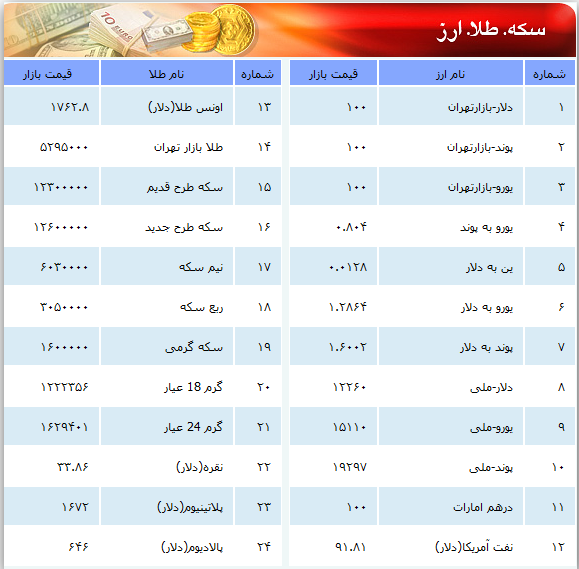 آخرين قيمت سكه و ارز چهارشنبه 19 مهر 1391