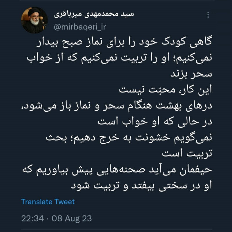 آیتالله سید محمدمهدی میرباقری، مدرس سطح خارج حوزه علمیه قم و رییس فرهنگستان علوم اسلامی در صفحه توئیتر خود به تربیت فرزندان برای نماز اشاره کرده است.