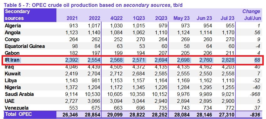 بر اساس این گزارش، تولید نفت ۱۳ کشور عضو این سازمان در ماه جولای ۲۰۲۳ (تیر ۱۴۰۲) ۲۷ میلیون و ۳۱۰ هزار بشکه در روز عنوان شده است که کاهش روزانه ۸۳۶ هزار بشکهای نسبت به ماه ژوئن را نشان میدهد.