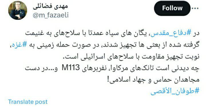 مهدی فضائلی تحلیل جالبی درباره نتیجه حمله زمینی صهیونیستها به غزه دارد.