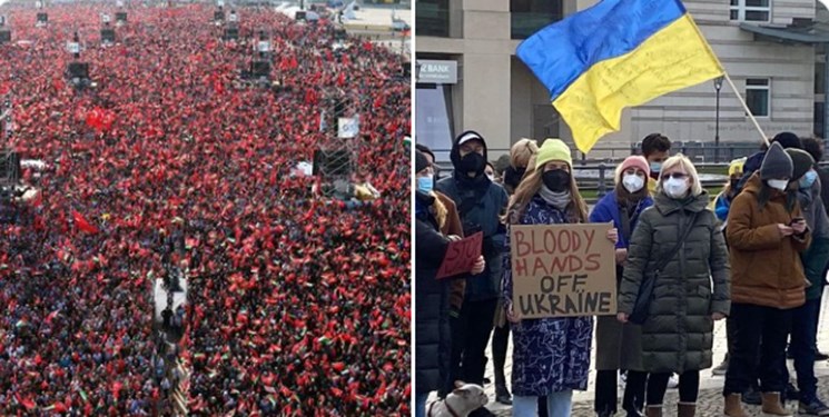 تصویر اول حضور دهها هزار نفر از مردم ترکیه در روز شنبه (۲۸ اکتبر، ششم آبان) در تجمع حمایت از فلسطین در شهر استانبول را نشان میدهد و تصویر دوم مربوط به تجمعی چند نفری حمایت از اوکراین در برلین در ژانویه سال ۲۰۲۲ است.