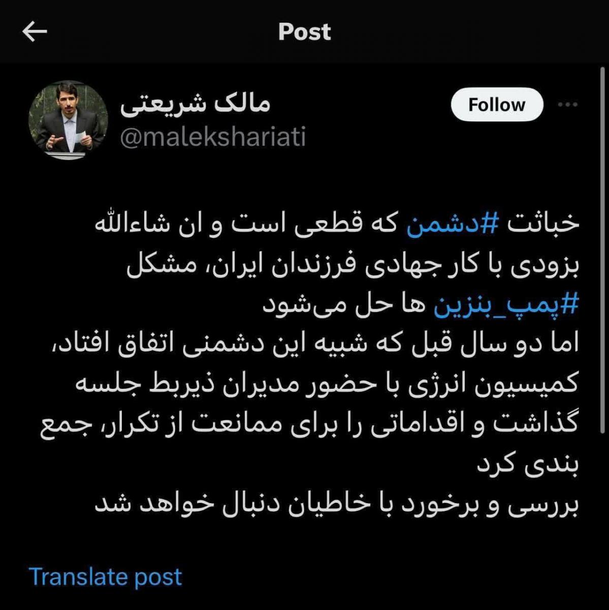 واکنش مالک شریعتی، عضو کمیسیون انرژی نسبت به هک شدن سامانه توزیع سوخت: منتظر برخورد باشید!