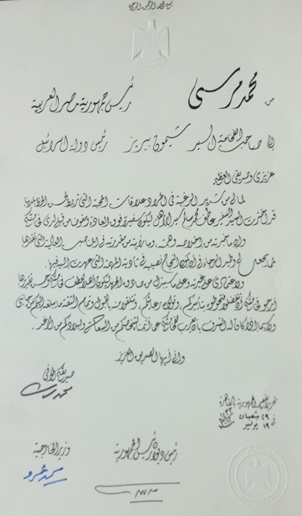 متن کامل نامه مرسی به شیمون پرز + تصویر