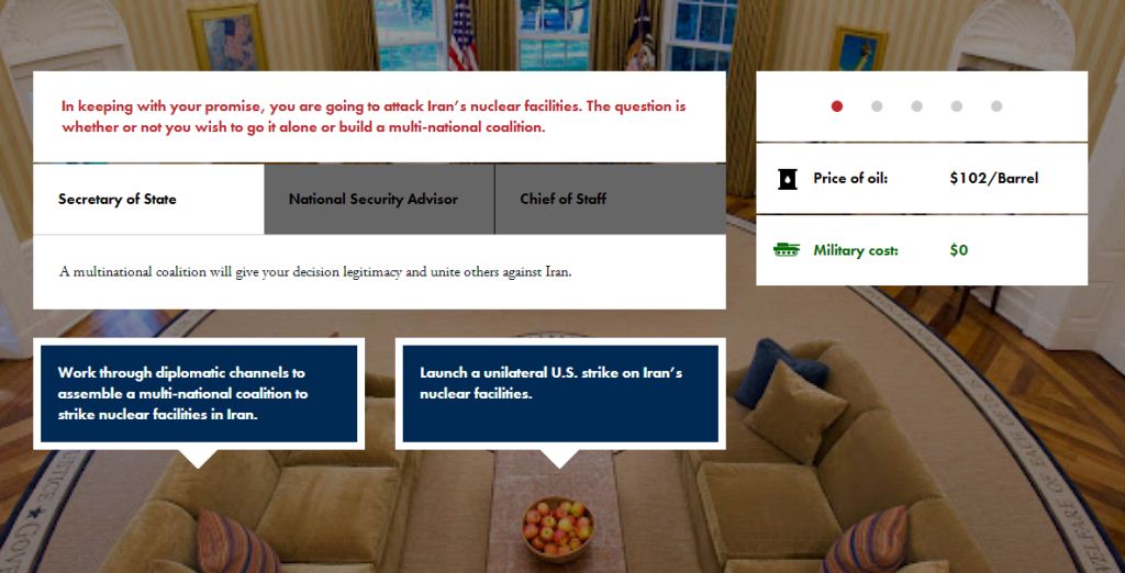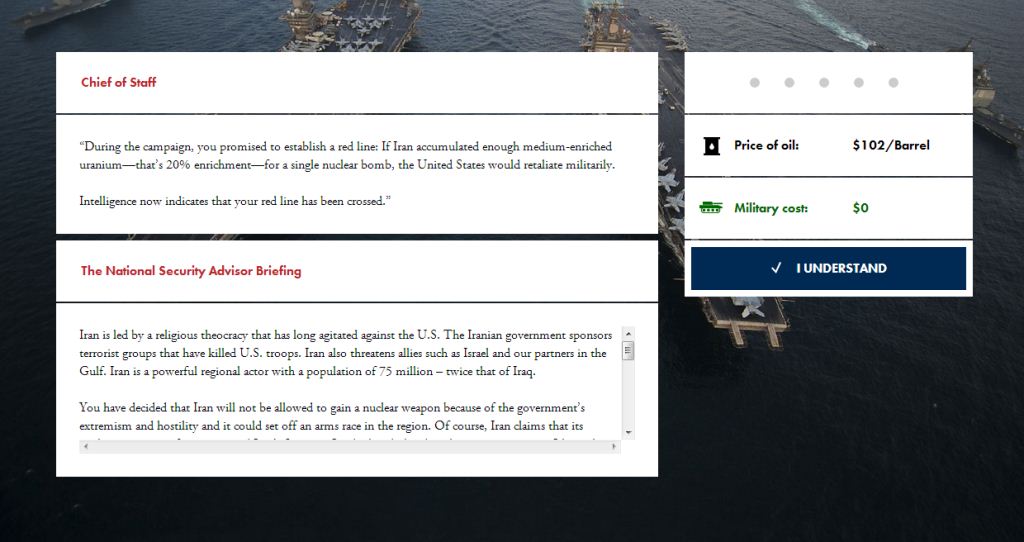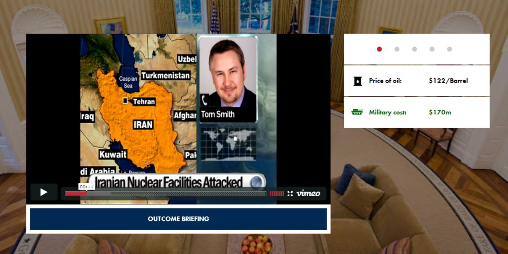 اما بازی با این سناریو آغاز میشود که ایالات متحده خط قرمزی برای ایران وضع کرده که غنی سازی 20 درصد برای یک ساخت بمب اتمی است. گویا منابع اطلاعاتی آمریکا، خبر دادهاند که ایران از این خط قرمز گذر کرده است؛ این سناریو برای این طراحی شده که کاربر تصمیم به یک اقدام نظامی گرفته و پیامدهای آن را از نزدیک ببیند.