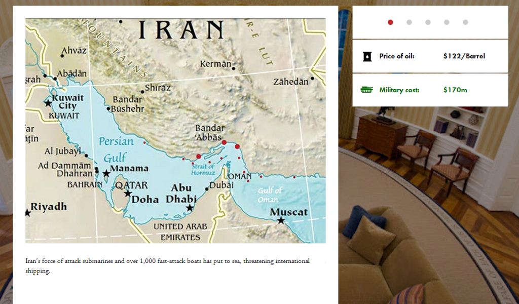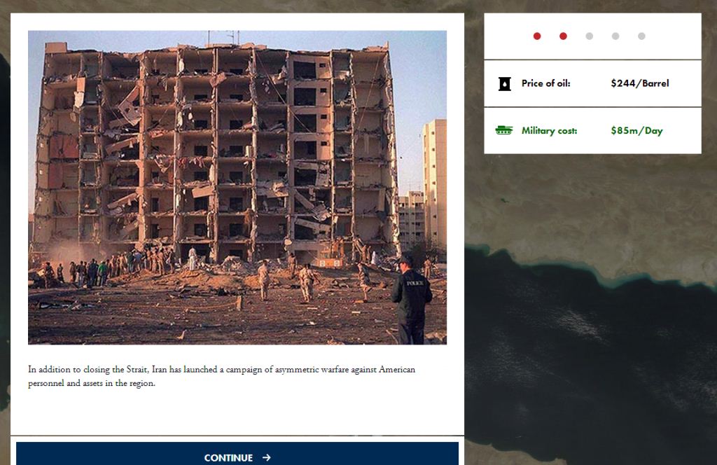 گام بعدی برای کاربر، گزینش بین باز کردن تنگه هرمز و یا گسترش جغرافیایی جنگ است. در این مرحله، بهای نفت به 244 دلار در هر بشکه رسیده و هزینههای جنگ، روزانه هشتاد میلیون دلار است.