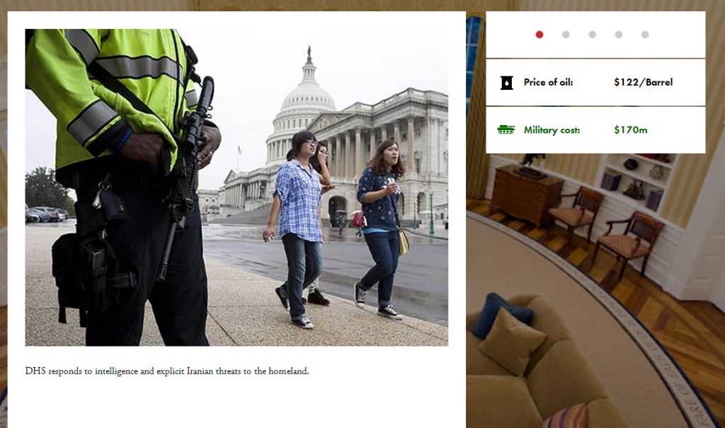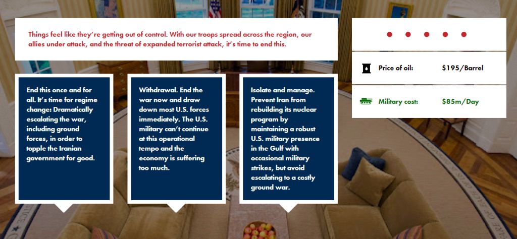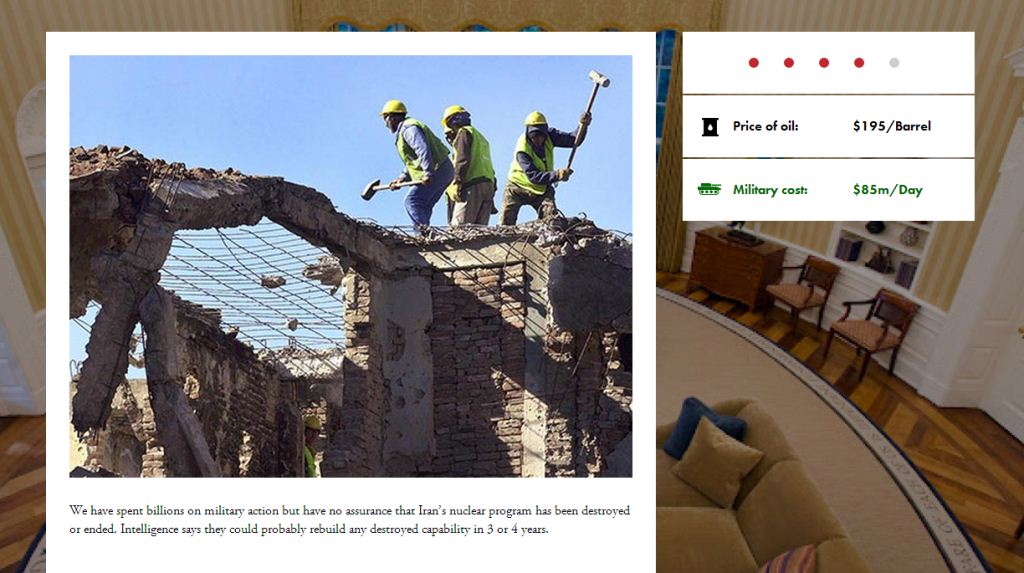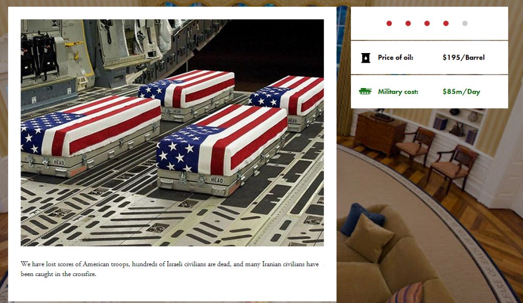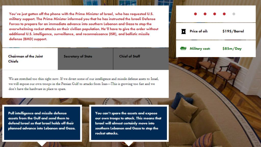 به گزارش «تابناک»، این یک بازی تحت وب است که شرکت «پروژه امنیت ملی تروما» آن را طراحی کرده است. در این بازی، کاربر به عنوان رئیس جمهور ایالات متحده درباره حمله نظامی به ایران تصمیم میگیرد و روند بازی به گونهای است که بر پایه رخدادهای در جنگ، تصمیمات گوناگونی برای رئیس جمهور آمریکا گرفته میشود.