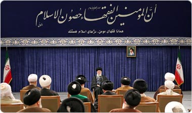 حضرت آیتالله خامنهای در این دیدار که آخرین دیدار دوره پنجم مجلس خبرگان با ایشان بود، با اشاره به برگزاری راهپیمایی پرشور ۲۲ بهمن و انتخابات ۱۱ اسفند، بهمن و اسفند ماه امسال را بیش از سالهای دیگر محلّ بروز نشانههای مردمسالاری اسلامی خواندند و در تبیین منطق ایستادگی و مقابله جمهوری اسلامی با زورگویان، گفتند: تا قبل از تشکیل جمهوری اسلامی، تنها جبهه موجود در دنیا جبهه دموکراسیهای وابسته به مشی لیبرال دموکراسی غربی بود اما با پیروزی انقلاب اسلامی، جبهه جدیدی بر مبنای مردمسالاری اسلامی تشکیل شد که طبیعتاً در مقابل جبهه دموکراسی غربی قرار میگرفت.