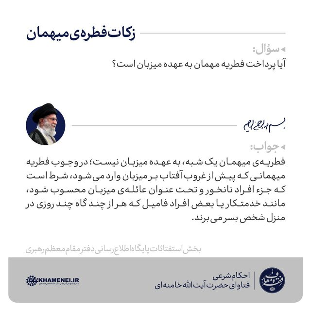 حضرت آیتالله خامنهای حکم زکات فطرهی میهمان را در قالب پاسخ به پرسشی بیان کردند.