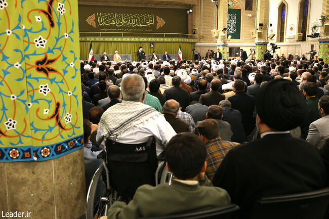 رهبر انقلاب اسلامی در این دیدار با تبریک عید فطر و آرزوی شادی و برکت برای ملت ایران و همه ملتهای مسلمان، با تجلیل از رقمخوردن فضای معنوی ممتاز در ماه مبارک رمضان، راهپیمایی روز قدس امسال را جلوهای دیگر از درخششهای ملت ایران در ماه مبارک رمضان برشمردند و افزودند: راهپیمایی بینظیر روز قدس، حرکت سیاسی و بینالمللی شگفتآفرینی بود که بر اساس گزارش افراد کاربلد، با حضور جمیعتهای متراکم و بیش از سالهای گذشته، به معنی واقعی به یک خروش عمومی تبدیل شد.
