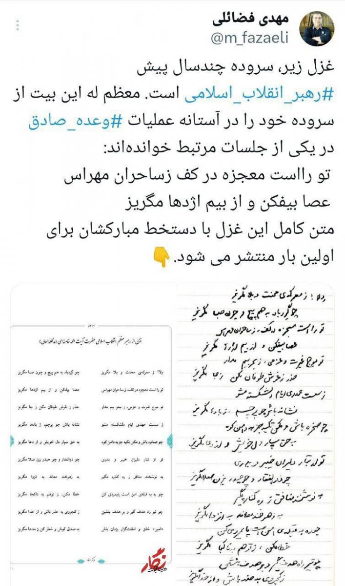 مهدی فضایلی عضو دفتر حفظ و نشر آثار رهبر انقلاب در صفحه توئیتر خود، غزلی را که حضرت آیتالله خامنهای یک بیت از آن را در آستانه عملیات وعده صادق در یک جلسه مرتبط خوانده بودند، منتشر کرد نوشت: