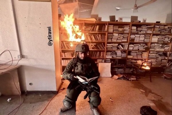 تصاویر منتشر شده در رسانه های رژیم صهیونیستی، نظامی صهیونیست را در حالی که کتابی در دست دارد نشان می دهد و در پشت آن آتش در میان کتابهای دانشگاه الاقصی زبانه می کشد.