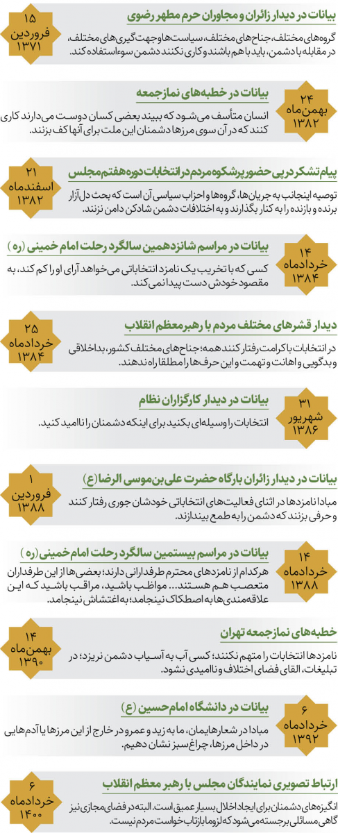 اینفوگرافیک زیر مروری است برتوصیههای راهبردی رهبرمعظم انقلاب به کاندیداها در ادوار مختلف درباره لزوم توجه به مطامع دشمنان.