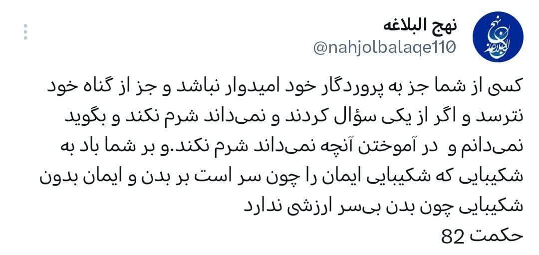 امیرالمومنین علی علیه السلام در حکمت 82 نهج البلاغه می فرماید: كسى از شما جز به پروردگار خود اميدوار نباشد و جز از گناه خود نترسد و اگر از يكى سؤال كردند و نمىداند شرم نكند و بگويد نمىدانم و در آموختن آنچه نمىداند شرم نكند.و بر شما باد به شكيبايى كه شكيبايى ايمان را چون سر است بر بدن و ايمان بدون شكيبايى چون بدن بىسر ارزشى ندارد.