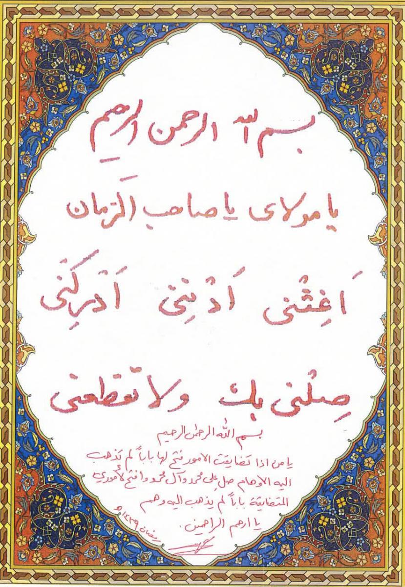«بسم الله الرحمن الرحیم، یا مولای یا صاحب الزمان! اغثنی، أدنِنی، ادرکنی، صِلْنی بک و لا تقطعنی»