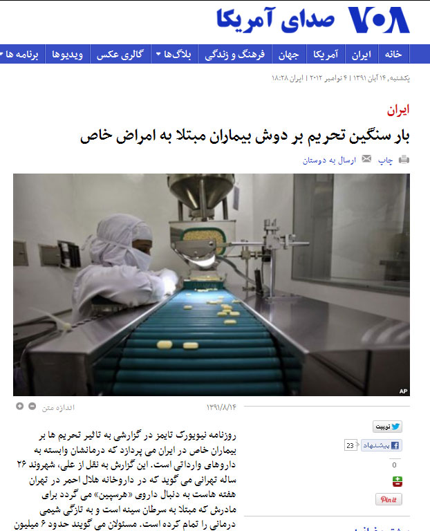 جام سیاسی؛ سایت صدای آمریکا (VOA) در خبری با عنوان "بار سنگین تحریم بر دوش بیماران مبتلا به امراض خاص" نوشت: «روزنامه نیویورک تایمز در گزارشی به تاثیر تحریم ها بر بیماران خاص در ایران می پردازد که درمانشان وابسته به داروهای وارداتی است. این گزارش به نقل از علی، شهروند ۲۶ ساله تهرانی می گوید که در داروخانه هلال احمر در تهران هفته هاست به دنبال داروی "هرسپین" می گردد برای مادرش که مبتلا به سرطان سینه است و به تازگی شیمی درمانی را تمام کرده است. مسئولان می گویند حدود ۶ میلیون بیمار که بسیاری از آنان به سرطان مبتلا هستند، از کمبود دارو در رنجند.