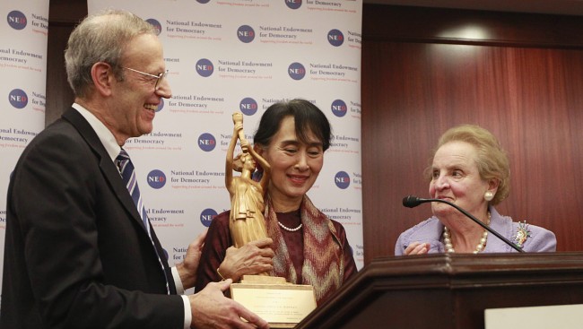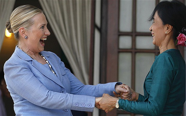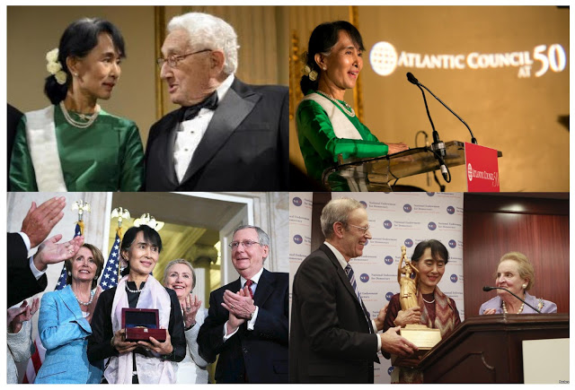 آنگسان سوچي در سپتامبر سال جاري به آمريکا سفر کرد و مورد استقبال گرم مقامات آمريکايي و همچنين موسساتي قرار گرفت که همواره در ايجاد انقانهايي که از وي حمايت ميکنند، مانند پروپاگانداهاي محلي مانند مجله اتي مانند بنياد جامعه باز جورج سوروس، موسسه ملي اعطاي دموکراسي و شوراي آتلانتيک که همگي سابقه درخشاني در مداخله در امور کشورهاي مستقل و گرفتن ماهي از آبهاي گلآلود دارند.