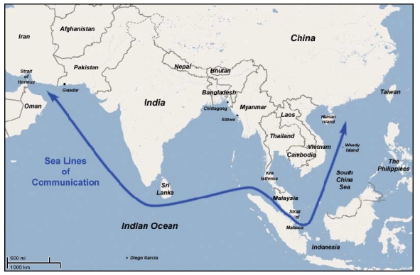 هر سال بیش از 50 هزار کشتی از تنگه مالاکا عبور میکند. کسی که بر این آبها کنترل داشته باشد درحقیقت گلوگاه عبور انرژی به چین را در دست خواهد داشت. چین بعد از تحولات عراق و حضور آمریکا در این کشور و تسلط بر چاههای نفت منطقه، حضور خود را در میانمار تقویت کرده است تا مانع از دستیابی آمریکا به تنگه مالاکا شود