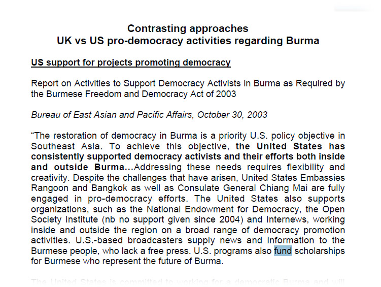 وزارت خارجه آمریکا همچنین رهبران اصلی مخالفان در سازمانهای ضد دولتی میانمار را جلب کرده و آنها را آموزش میدهد. این وزارتخانه از سال 2003 هر سال بیش از 2.5 میلیون دلار به فعالیتهای بنیاد ملی دمکراسی در میانمار اختصاص میدهد.