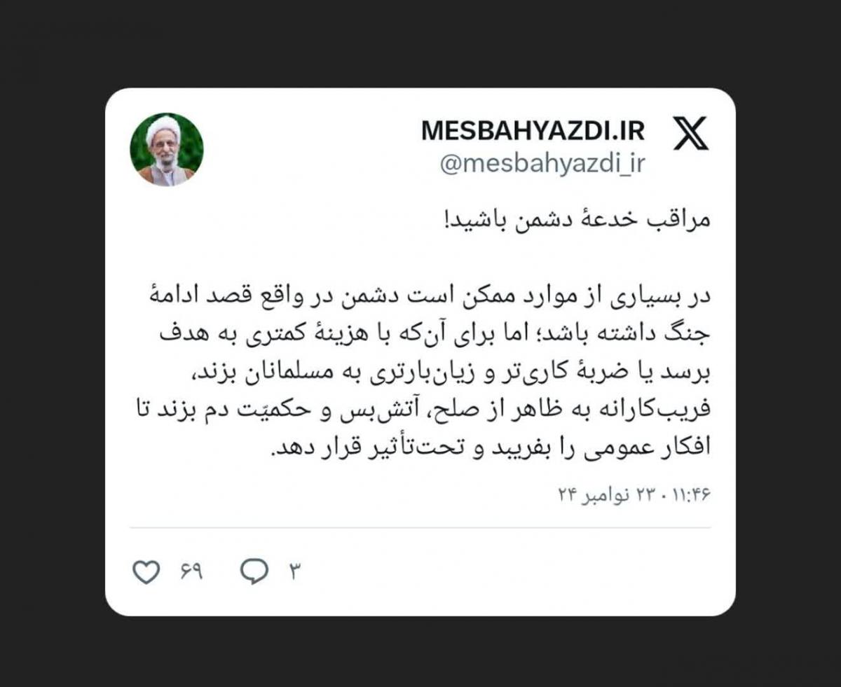 علامه مصباح یزدی: در بسیارى از موارد ممکن است دشمن در واقع قصد ادامۀ جنگ داشته باشد؛ اما براى آنکه با هزینۀ کمترى به هدف برسد یا ضربۀ کاریتر و زیانبارترى به مسلمانان بزند، فریبکارانه به ظاهر از صلح، آتشبس و حکميّت دم بزند تا افکار عمومى را بفریبد و تحتتأثیر قرار دهد.