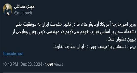 وزیر امورخارجه آمریکا: آزمایشهای ما در تغییر حکومت ایران به موفقیت ختم نشدهاند.من بر اساس تجارب خودم میگویم که مهندسی کردن چنین وقایعی از بیرون دشوار است.