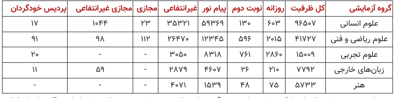 ظرفیت رشتههای بدون آزمون در میان گروههای آزمایشی ۵۸ درصد به گروه علوم انسانی، ۲۵ درصد به گروه علوم ریاضی و فنی، ۹ درصد به گروه علوم تجربی، ۵ درصد به گروه زبانهای خارجی و ۳ درصد به گروه هنر اختصاص دارد.