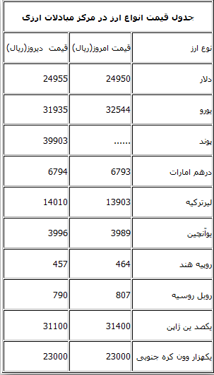 برهمین اساس، قیمت دلار مبادلاتی امروز چهارشنبه 2495 تومان ، یورو 3254 تومان، درهم 679 تومان و لیر ترکیه 1390 تومان نرخگذاری شده است. در همین حال، پوند که دیروز برای نخستین بار میهمان مرکز مبادلات ارزی شده بود، امروز دیگر در نرخنامه این مرکز جای ندارد. قیمت انواع ارز در مرکز مبادلات ارزی در روز چهارشنبه به شرح جدول ذیل است: