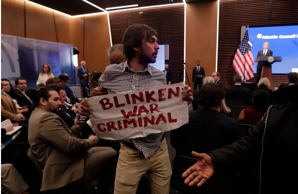یک معترض که در مراسم «شورای آتلانتیک» نفوذ کرده بود، فریاد زد: آقای وزیر بلینکن! میراث شما نسلکشی خواهد بود! شما برای همیشه به عنوان «بلینکن خونریز، وزیر نسل کش» شناخته خواهید شد. افسران امنیتی این معترض را همراه مردی با پلاکاردی که روی آن نوشته شده بود «بلینکن: جنایتکار جنگی»، بیرون بردند.