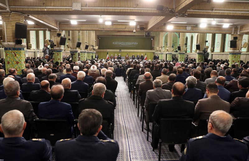 رهبر انقلاب با اشاره به آیاتی از قرآن کریم که بغض و کینه دشمنان اسلام را بزرگتر از آنچه بر زبان و رفتار آنها جاری است میداند، گفتند: اینکه نمایندگان کنگره آمریکا برای قاتل و عامل تکه تکه کردن هزاران کودک کف میزنند و او را تشویق میکنند و یا به کاپیتان ناو آمریکایی که هواپیمای مسافربری ایران با ۳۰۰ سرنشین را سرنگون کرد مدال تشویقی میدهند، نمونههایی از باطن خبیث و دشمنیها و کینههای آنها است که پشت لبخندهای دیپلماسی پنهان است و باید در مقابل این حقایق، چشمان خود را باز کنیم و به تعبیر قرآن، به دنبال دوستی پنهانی با آنها نباشیم.