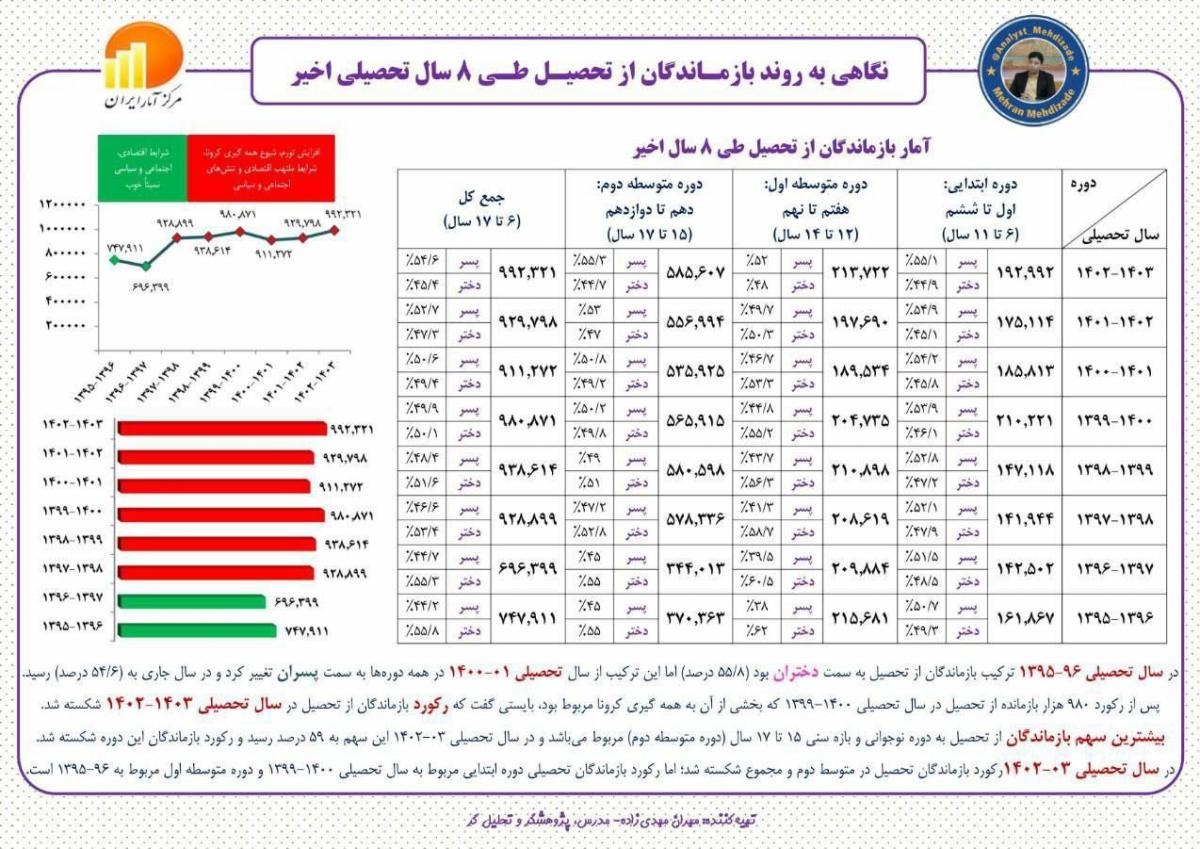 ۹۹۲۳۲۱ دانشآموز به دلیل بازماندگی از تحصیل در مدارس حضور ندارند و بیشترین جمعیت بازماندگان از تحصیل مربوط به دوره متوسطه اول است همچنین پسران به نسبت دختران بیشتر ترک تحصیل میکنند.