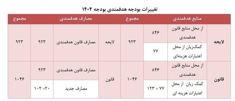 اما در مراحل بررسی احکام بودجه در مجلس دو حکم مرتبط با بودجه هدفمندی تصویب شد که از این محل در مجموع به میزان ۱۲۳ هزار میلیارد تومان به مصارف بودجه افزوده شد بر اساس حکم بند «چ» تبصره (۵) دولت مکلف شد در سال ۱۴۰۴ اعتبار لازم برای جبران قدرت خرید خانوارهای طبقات متوسط و پایین درآمدی جامعه را متناسب با اصلاح تدریجی نرخ ارز ترجیحی در ردیف مستقل پیش بینی نموده و به دستگاههای اجرایی مرتبط پرداخت نماید. لذا منابع این حکم به میزان ۱۰۲ هزار میلیارد تومان به کمک زبان پرداختی به سازمان هدفمندی افزوده شد.