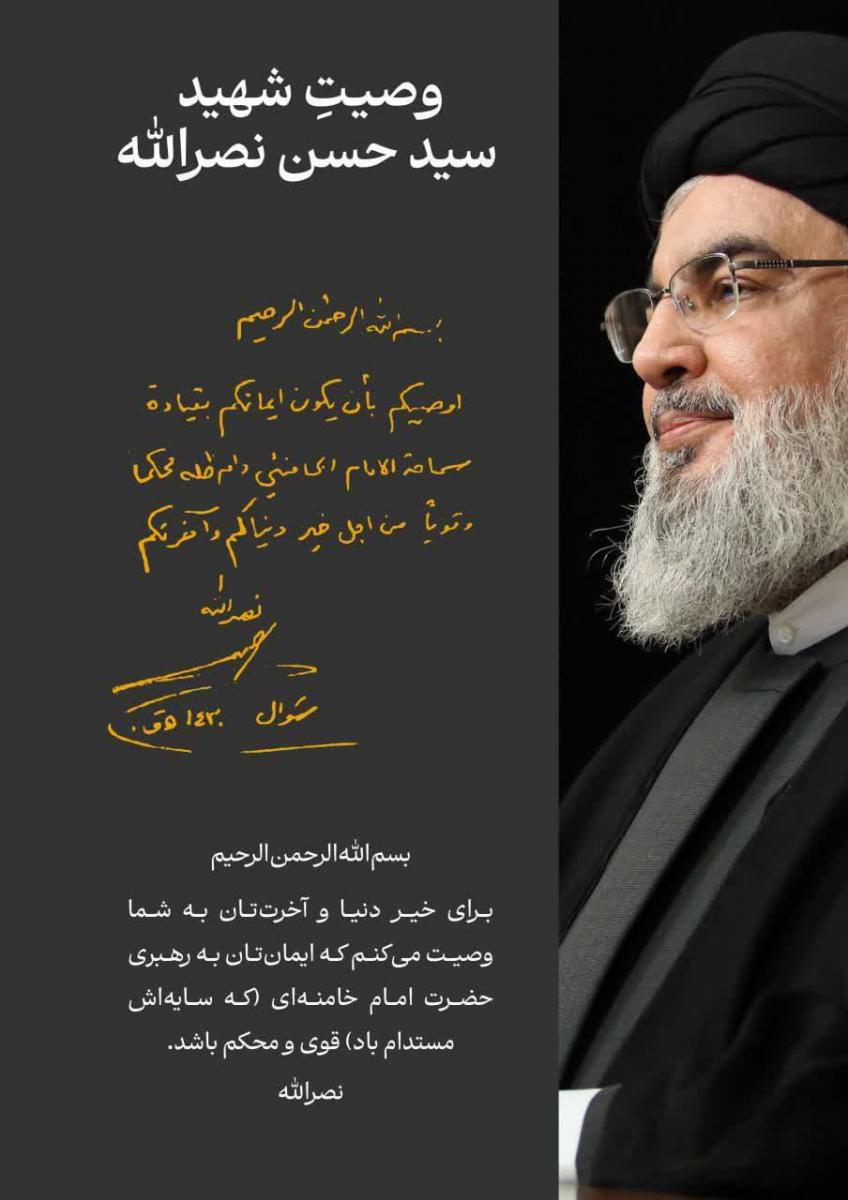 بسم الله الرحمن الرحیم برای خیر دنیا و آخرتتان به شما وصیت میکنم که ایمانتان به رهبری حضرت امام خامنهای (که سایهاش مستدام باد) قوی و محکم باشد.