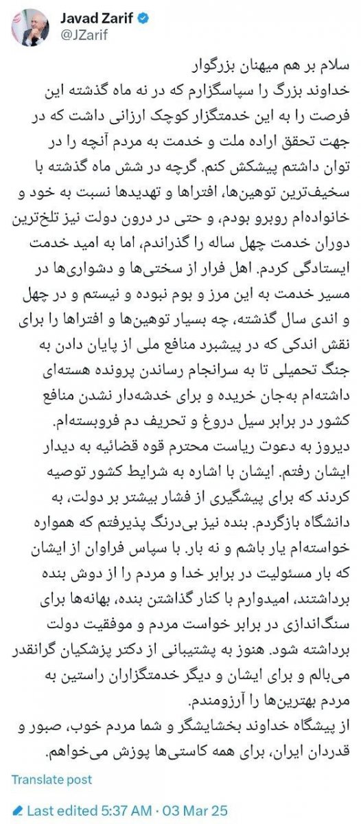 وی افزود: گرچه در شش ماه گذشته با سخیفترین توهینها، افتراها و تهدیدها نسبت به خود و خانوادهام روبرو بودم، و حتی در درون دولت نیز تلخترین دوران خدمت ۴۰ ساله را گذراندم، اما به امید خدمت ایستادگی کردم. اهل فرار از سختیها و دشواریها در مسیر خدمت به این مرز و بوم نبوده و نیستم و در چهل و اندی سال گذشته، چه بسیار توهینها و افتراها را برای نقش اندکی که در پیشبرد منافع ملی از پایان دادن به جنگ تحمیلی تا به سرانجام رساندن پرونده هستهای داشتهام بهجان خریده و برای خدشهدار نشدن منافع کشور در برابر سیل دروغ و تحریف دم فروبستهام.