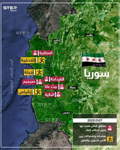 گزارشهای رسانهای حاکی از گسترش درگیریها در سوریه به لاذقیه، طرطوس، السویداء و درعا است.
